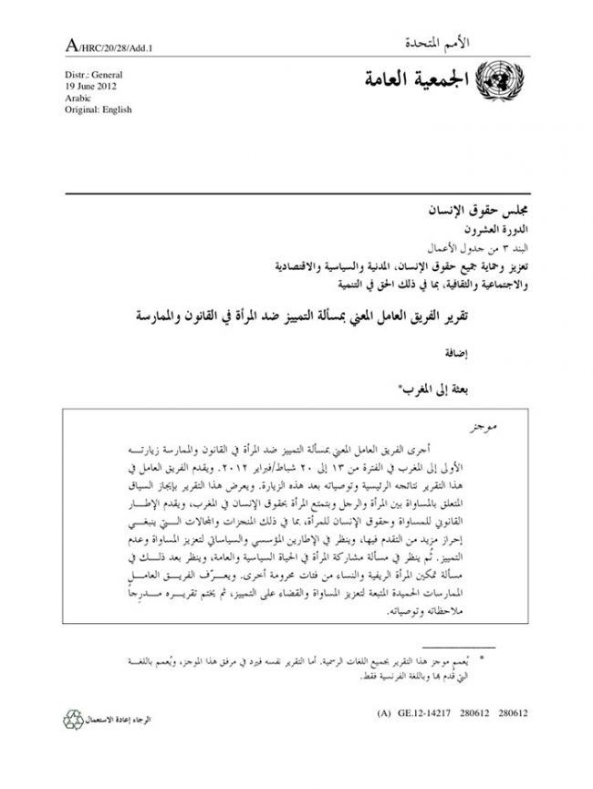 أجرى الفريق العامل المعني بمسألة التمييز ضد المرأة في القانون والممارسة زيارتـه الأولى إلى المغرب في الفترة من ١٣ إلى ٢٠ شباط/فبراير ٢٠١٢. ويقدم الفريق العامل في هذا التقرير نتائجه الرئيسية وتوصياته بعد هذه الزيارة. ويعرض هذا التقرير بإيجاز السياق المتعلق بالمساواة بين المرأة والرجل وبتمتع المرأة بحقوق الإنسان في المغرب، ويقدم الإطـار القانوني للمساواة…
