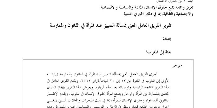 أجرى الفريق العامل المعني بمسألة التمييز ضد المرأة في القانون والممارسة زيارتـه الأولى إلى المغرب في الفترة من ١٣ إلى ٢٠ شباط/فبراير ٢٠١٢. ويقدم الفريق العامل في هذا التقرير نتائجه الرئيسية وتوصياته بعد هذه الزيارة. ويعرض هذا التقرير بإيجاز السياق المتعلق بالمساواة بين المرأة والرجل وبتمتع المرأة بحقوق الإنسان في المغرب، ويقدم الإطـار القانوني للمساواة وحقوق الإنسان للمرأة، بما في ذلك المنجزات واﻟﻤﺠالات الـتي ينبغـي إحراز مزيد من التقدم فيها، وينظر في الإطارين المؤسسي والسياساتي لتعزيز المساواة وعدم التمييز. ُثم ينظر في مسألة مشاركة المرأة في الحياة السياسية والعامة، وينظر بعد ذلـك في مسألة تمكين المرأة الريفية والنساء من فئات محرومة أخرى. ويعـ ّرف الفريـق العامـل الممارسات الحميدة المتبعة لتعزيز المساواة والقضاء على التمييز، ثم يختم تقريـره مـد ِرج ًا ملاحظاته وتوصياته